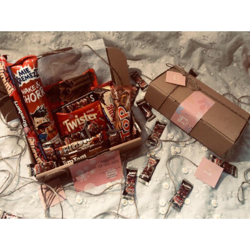 SNACK GIFT BOX untuk hadiah kepada orang tersayang, keluarga, teman, pacar. terdiri dari 8-10 snack didalam box.