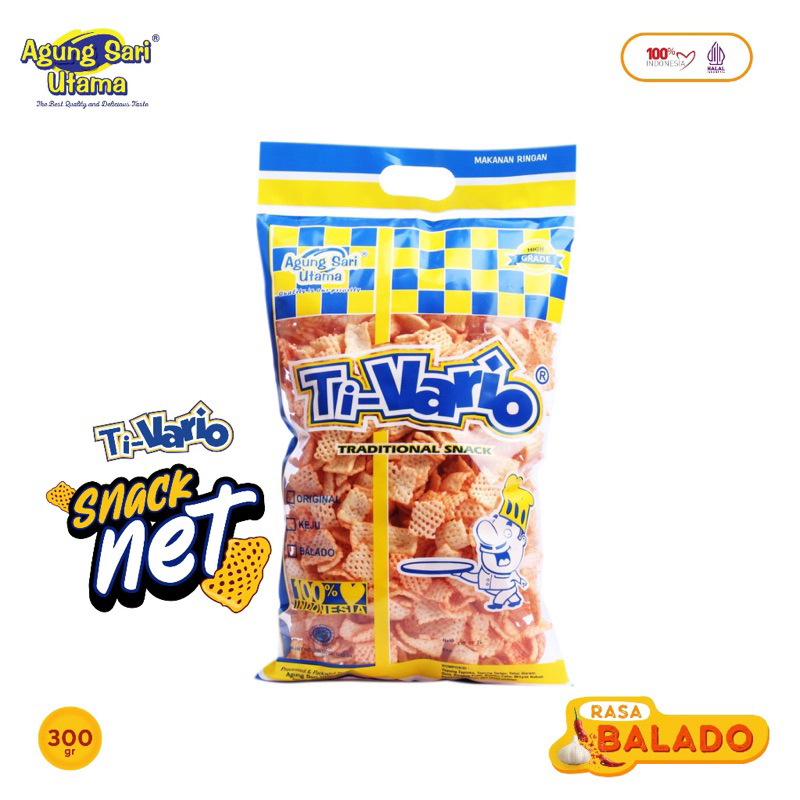 Snack net Ti-Vario memiliki bentuk seperti jaring dengan rasa original, keju dan balado yang enak dan gurih. Berat kemasan 300 gram. Cemilian ini sangat cocok di sajikan ketika ada teman atau keluarga berkunjungan ke rumah kita.