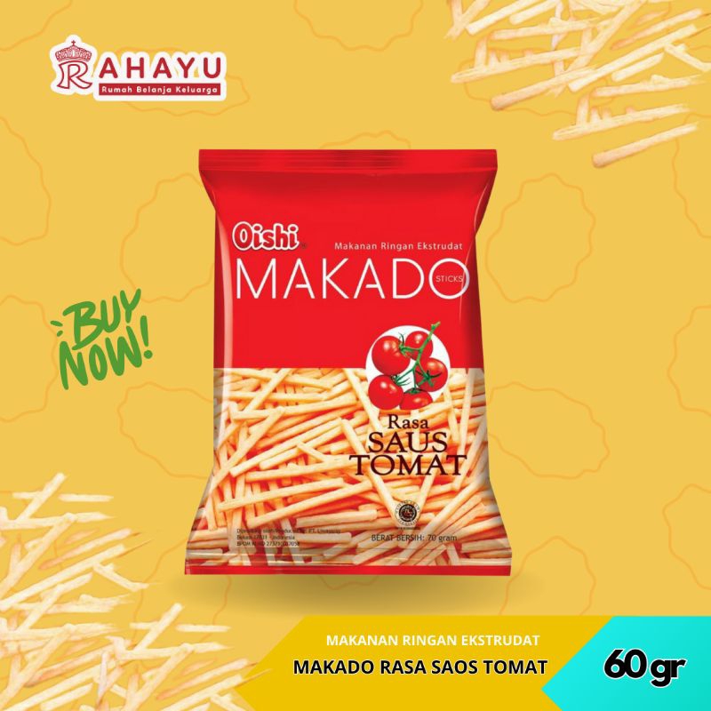 Oishi Makado Rasa Saus Tomat adalah makanan ringan berbentuk stik yang rasanya seperti saus tomat. Makanan ringan ini cocok untuk cemilan saat piknik atau menonton.