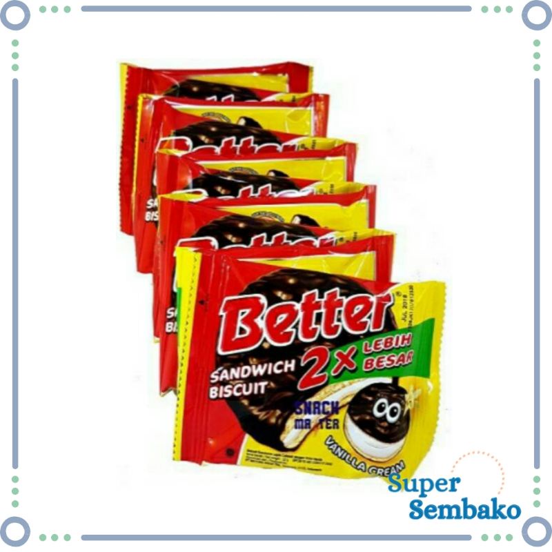 Better hadir dengan kemasan baru 2 kali lebih besar! Biskuit sandwich dengan isi vanilla cream yang dibalut dengan coklat