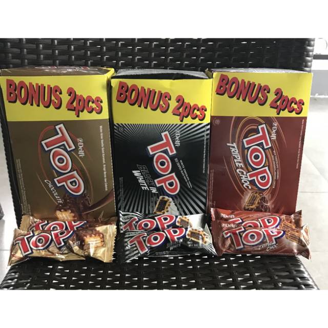 Top adalah sejenis makanan ringan yang berbahan dasar wafer lainnya yang diproduksi oleh Delfi. Dengan rice crispy and lapisan coklat yang membuatnya semakin lezat.