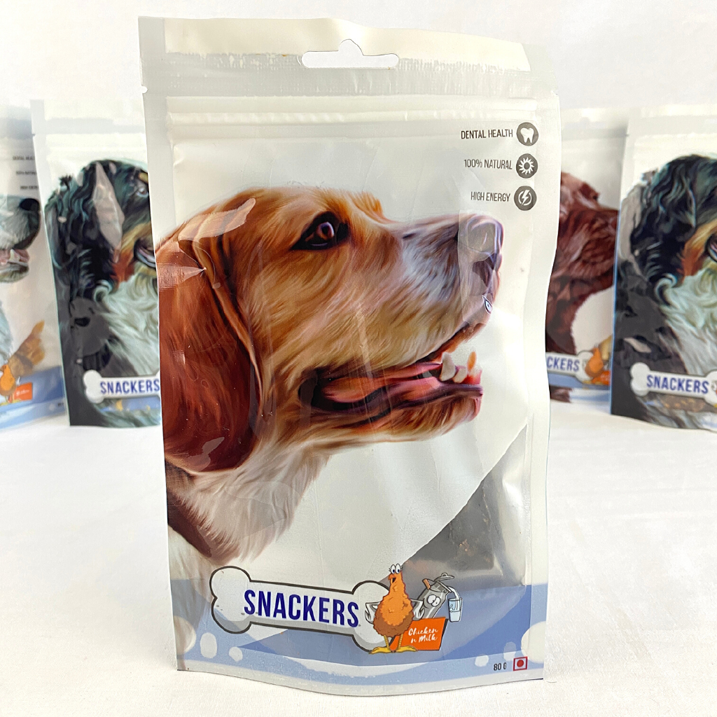 Snackers, healthy sticks made of fresh meat.Size: 80 GrLife Stage: All life stagesKey Benefits:Great taste for dogs.High digestibility.Rich in proteins.Low fat.Omega 3 and 6.Ingredients: Chicken, Vegetable glycerin, Natural flavor, Potassium sorbate,Vitamin E, Vitamin A.