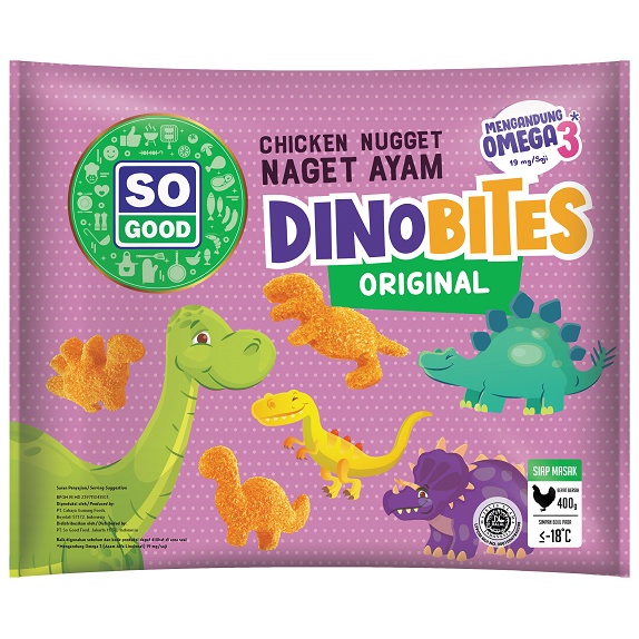 So Good Chicken Nugget DINOBITES sajian yang menggugah selera , diolah dari daging dada ayam pilihan, dan dibalut dengan breadcrumb yang renyah. So Good Chicken Nugget DINOBITES hidangan kaya protein dengan rasa original, lezat dan disukai anak-anak. Bentuk dinosaurus yang playful membuat saat makan anak menjadi semakin menyenangkan, dan melatih kreativitas serta imaginasi. Cocok sebagai camilan dan lauk untuk anak tercinta.
