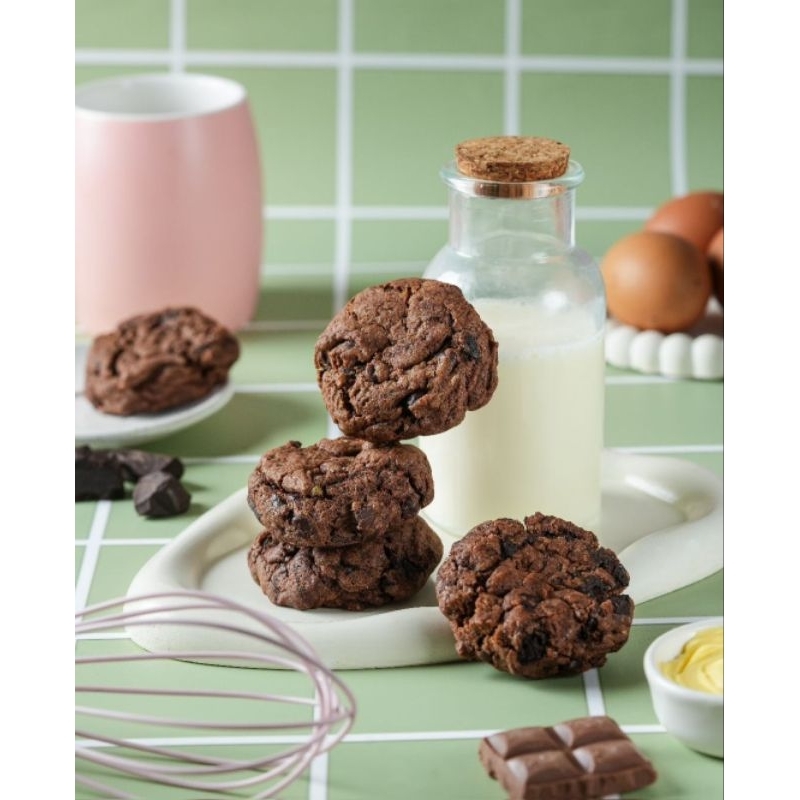 soft cookies dengan variant double chocolate , ditambah topping potongan dark coklat dan chococip