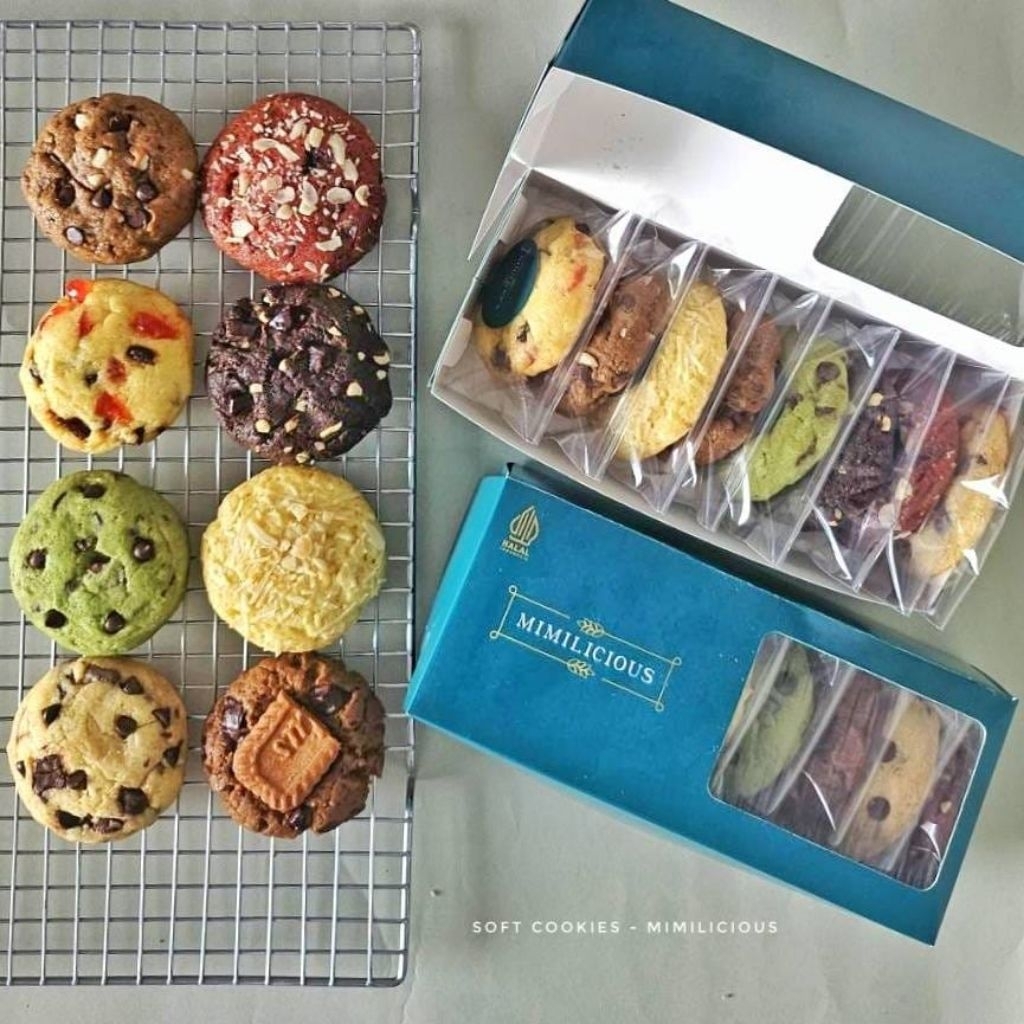 Soft Cookies dengan variasi mix 8 varian rasa dalam 1 box (Red velvet cheese, Lotus latte, Doublechoco, Vanilla Cheese, Cherry & Raisin, Classic Cinnamon, Vanilla Choco, Green Tea)