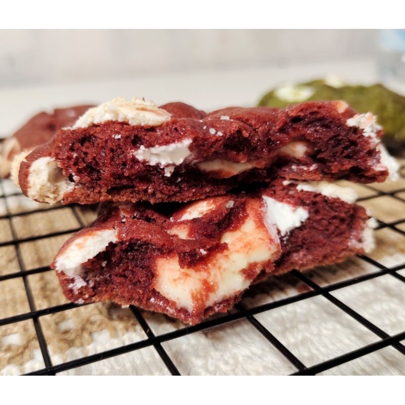 Nikmati sensasi red velvet yang lembut dan menggugah selera, dipadukan dengan potongan keju creamy yang meleleh di setiap gigitannya. Perpaduan sempurna antara rasa manis khas red velvet dan gurihnya keju, menghasilkan pengalaman cookies yang unik dan memuaskan. Ideal untuk pecinta rasa manis dengan sentuhan cheesy yang tak terlupakan!