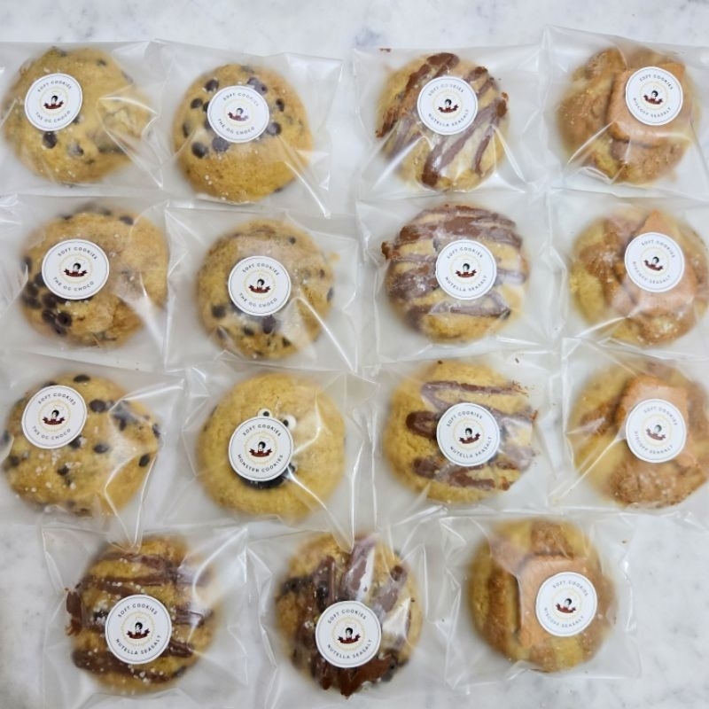 1 pcs Soft Cookies (+/-) 80-90 gram dengan Wijsman dan bahan premium lainnya, tekstur cookies renyah di luar dan lembut di tengah, dikombinasi dengan taburan garam laut memberikan sensasi asin yang membuat soft cookies ini makin nikmat.
