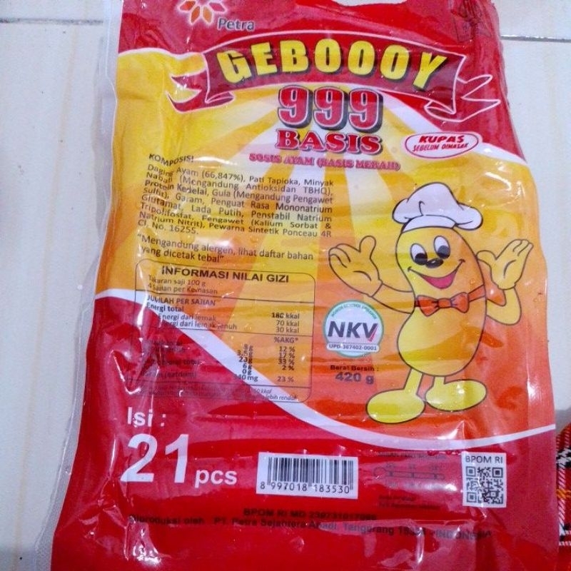 SOSIS AYAM GEBOOY 21PCS. DI PRODUKSI OLEH PT PETRA SEJAHTERA ABADI.SIAP SAJI SOSIS AYAM KUPAS. BERSETIFIKASI HALAL. BPOM 239731017088. BERAT BERSIH: 420 G. STOK BARU.