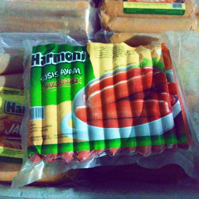 Sosis ayam Harmoni .sosis ayam dengan rasa yang enak dan sehat .berat 500 gram,satu pack isi 22 .satu karton isi 16 pack.