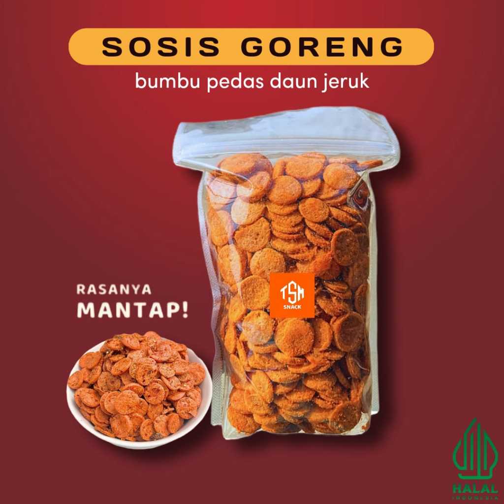 SosisGoreng Adalah Makanan ringan dengan bahan dasar utama Tepung Tapioka yang dicampur dengan ikan laut, Diproduksi dipabrik sendiri, dibentuk seperti sosis yang dipotong potong, Diberi penyedap rasa dan bumbu rempah sambal balado pedas yang memberikan Rasa Pedas Gurih Manis.