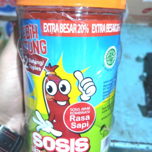 Sosis enak, tinggal makan, bisa jg kalo mau dimasak lagi. Dijamin halal. Kemasan toples yang didalamnya berisi 24+1 pcs. Promo bonus 2 pcs didalamnya.