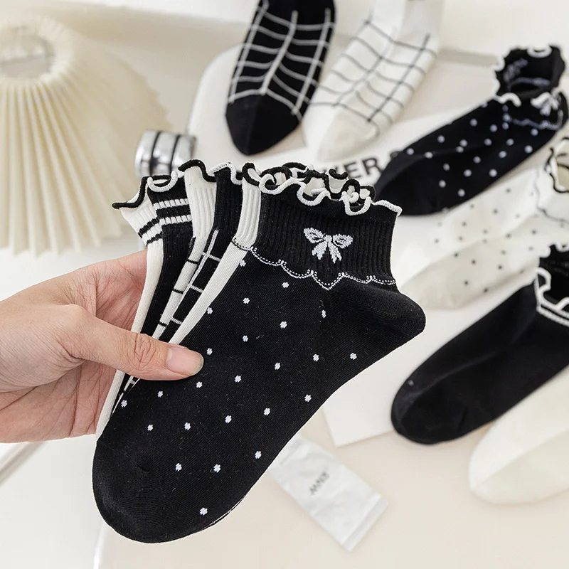SP & CITY/Короткие хлопковые женские носки с рюшами по краям весенние тонкие кружевные милые носки JK с бантом черно-белые дышащие носки в студен...