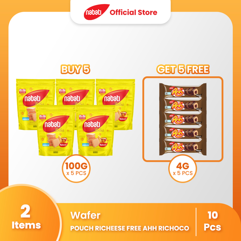 Jumlah: 5 pcs wafers pouch 100g + 5 pcs Ahh Richoco 4g gratis.
