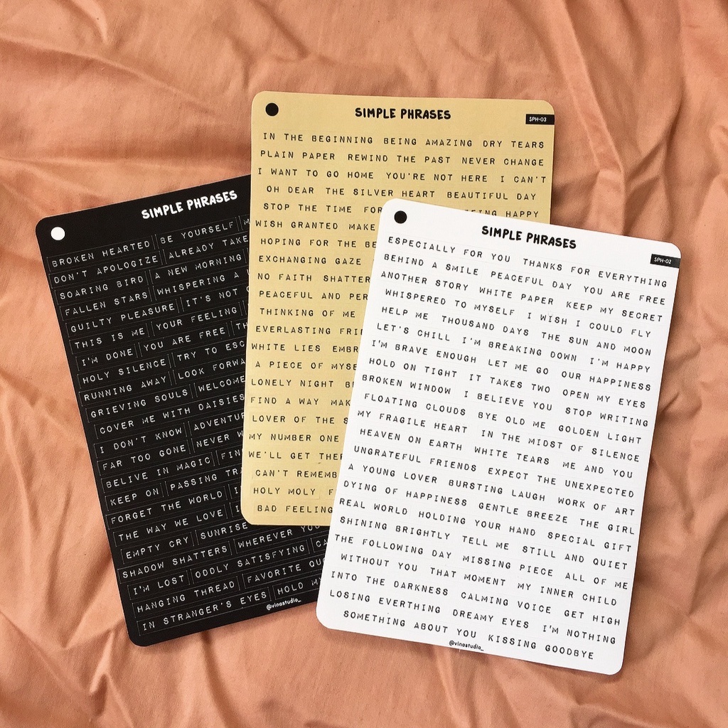 Sticker desain original bertema kalimat-kalimat pendek dengan style label. Terdapat ± 65 sticker kata-kata dalam 1 lembar. Cocok digunakan untuk menghias planner ataupun jurnal, atau ditempelkan pada barang-barang pribadi.