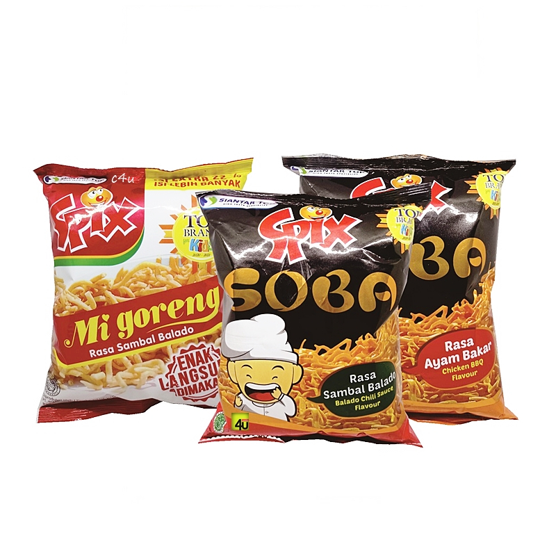 Produksi PT Siantar Top Tbk - Sidoarjo. Snack yg sudah cukup lama beredar di Indonesia. Makanan ringan ini masuk kedalam jenis cistik, atau stik2 berbahan adonan terigu dgn kerenyahan yg enak. Spix sedikit berbeda, mempuyai bentuk dan tekstur seperti mie yg ikal dan tipis renyah. Mempunyai berbagai bumbu tabur yg enak dan berbagai kemasan. Salah satunya kemasan cukup besar yaitu 45gr. Beratribut lengkap BPOM RI dan Halal MUI. Silahkan di order.