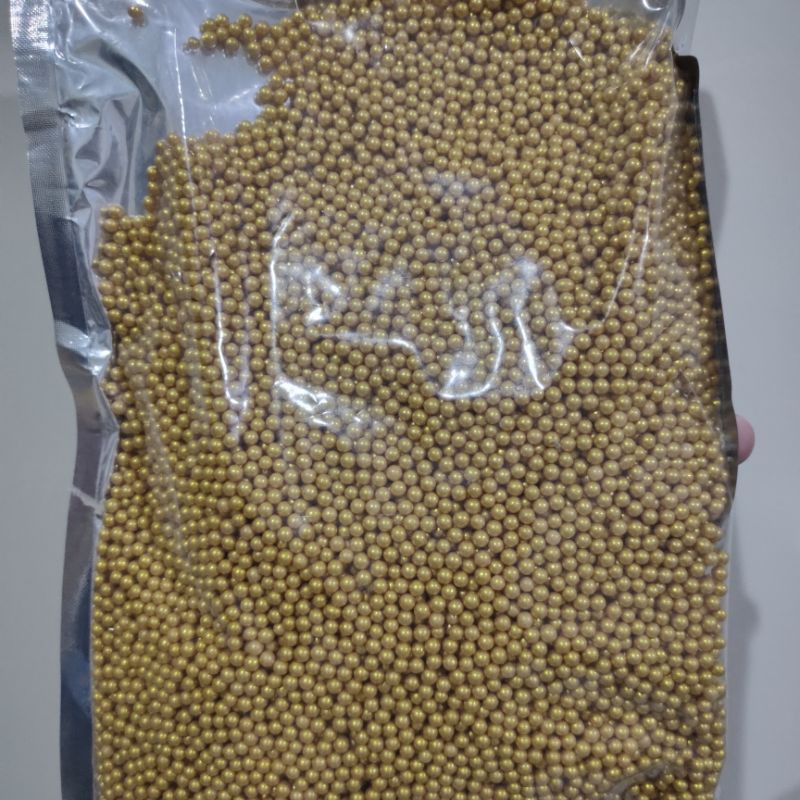 SPRINKLE MUTIARA GOLD UKR +/- 4 MM, HIASAN CAKE UNTUK DEKORASI KUE SEMAKIN CANTIK GOLD PEARL BISA DIMAKAN. Expire Date Febuari 2023 , KEMASAN TOPLES 1 KG.