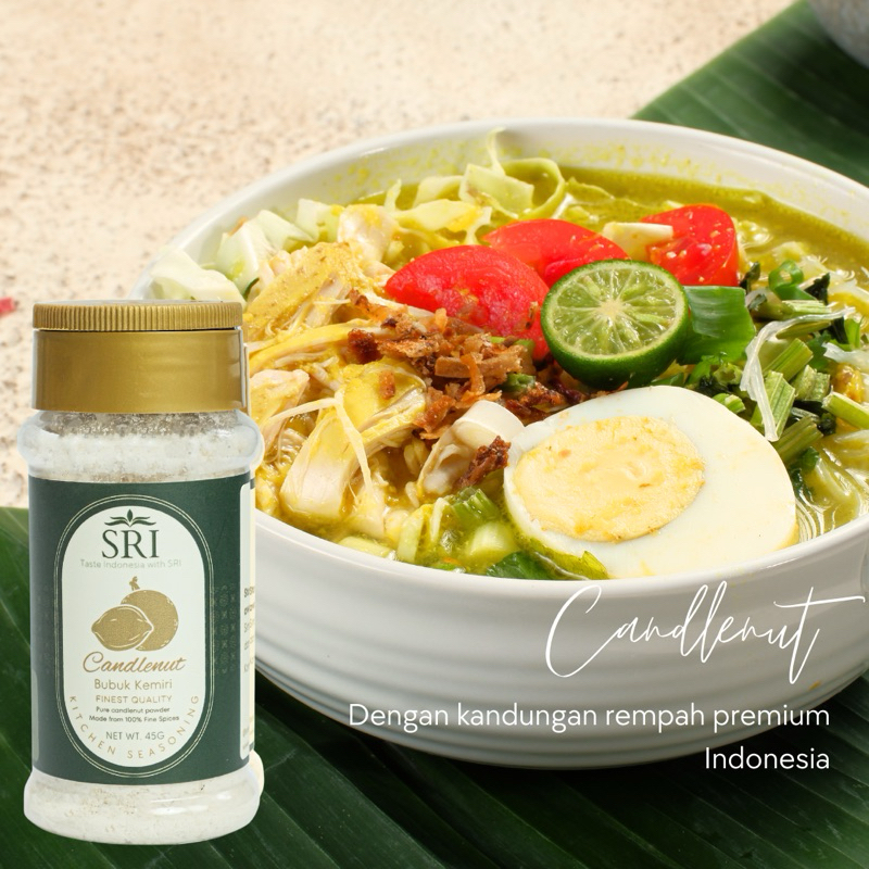 Bubuk Kemiri SRI 100% terbuat dari Kemiri segar yang dikeringkan dan diproses hingga menjadi bubuk.