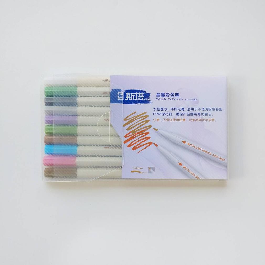 STA Metallic Brush Pen isi 10 warna. Ujung fleksibel (brush). Swatch bisa dilihat di gambar kedua. Warna putih bisa dilihat di kertas gelap. FREE LETTERING TUTORIAL.