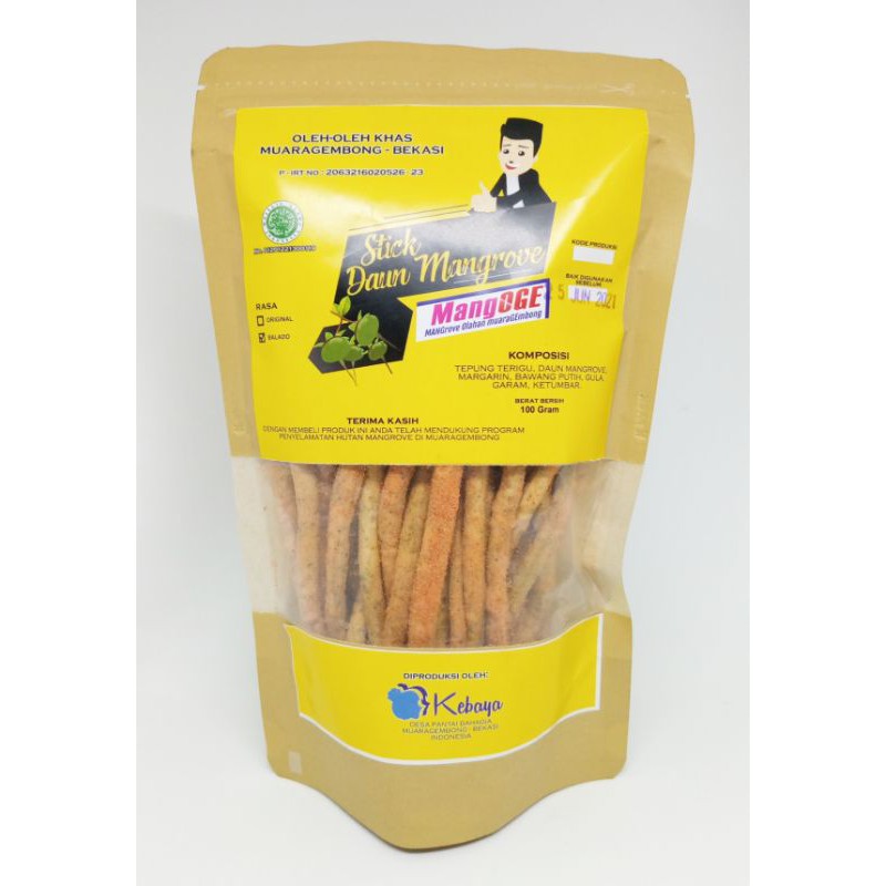 cemilan stick mangrove terbuat dari tepung terigu, daun mangrove yang telah dihaluskan, bawang putih, gula, garam dan ketumbar.
