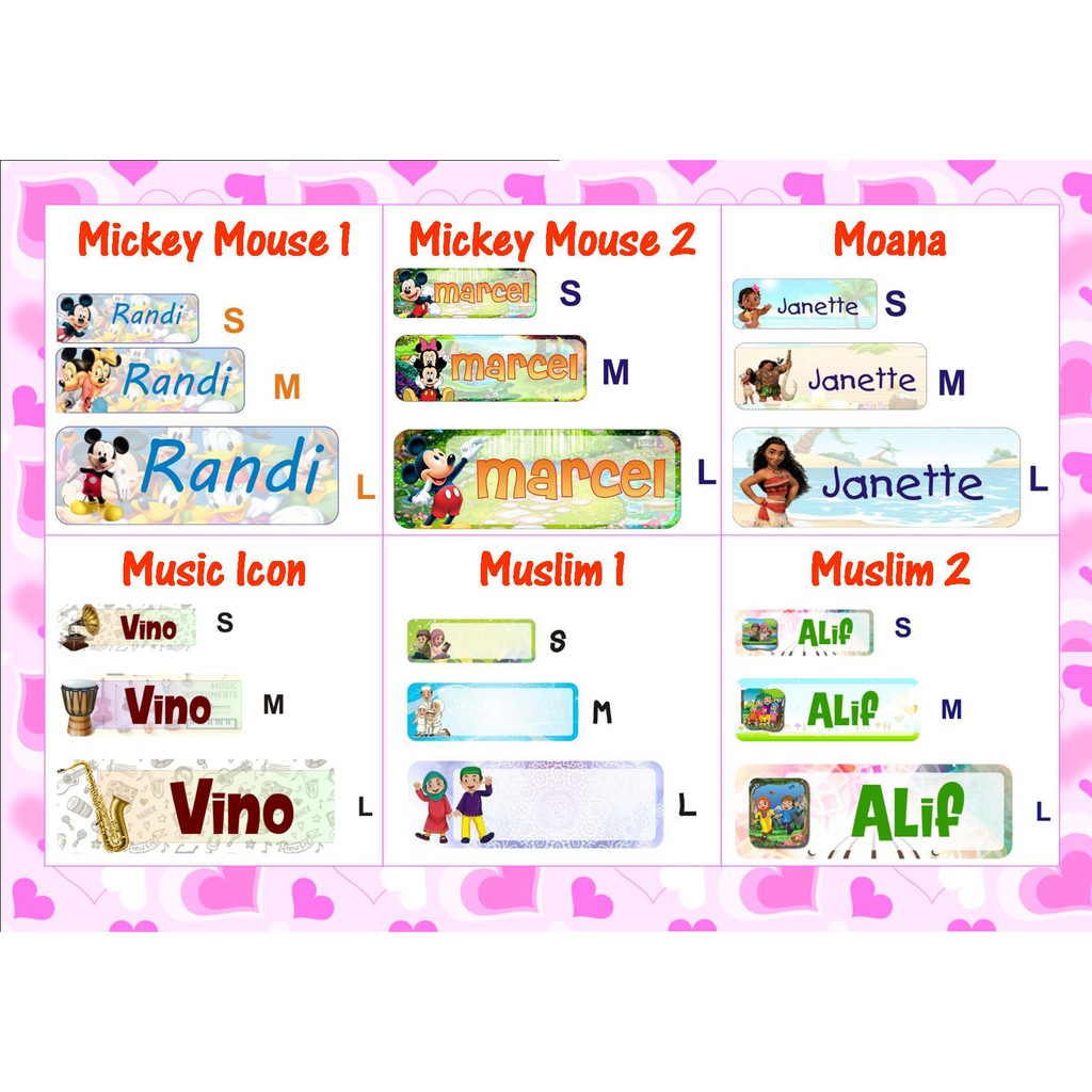 STIKER STICKER LABEL NAMA WATERPROOF BASIC: MICKEY MOUSE , MOANA , MUSIC ICON , MUSLIM