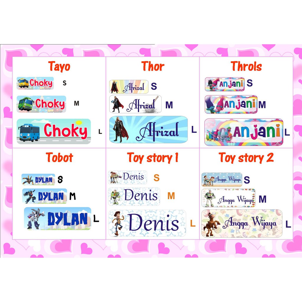 STIKER STICKER LABEL NAMA WATERPROOF BASIC: TAYO , THOR , THROLS , TOBOT , TOY STORY