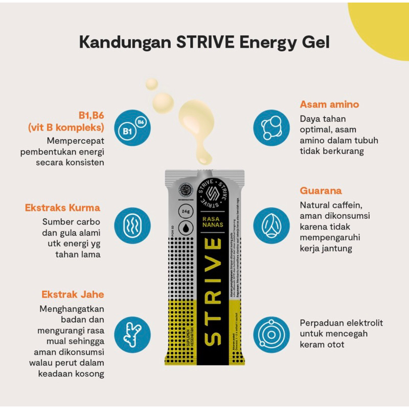 Pada sachet Strive energy gel terdapat 90 Kalori dan berbahan dasar terdapat Maltodekstrin, Ekstrak Kurma, Jahe, dan Asam Amino yang berperan sebagai bahan bakar utama dikarenakan cepat diserap oleh usus dan meningkatkan gula darah lebih cepat. Selain sebagai bahan bakar utama yang cepat diserap oleh tubuh, terdapat juga berbagai nutrisi yang dukung mekanisme tubuh optimal. Strive Energy Gel baik digunakan selama dan setelah berolahraga