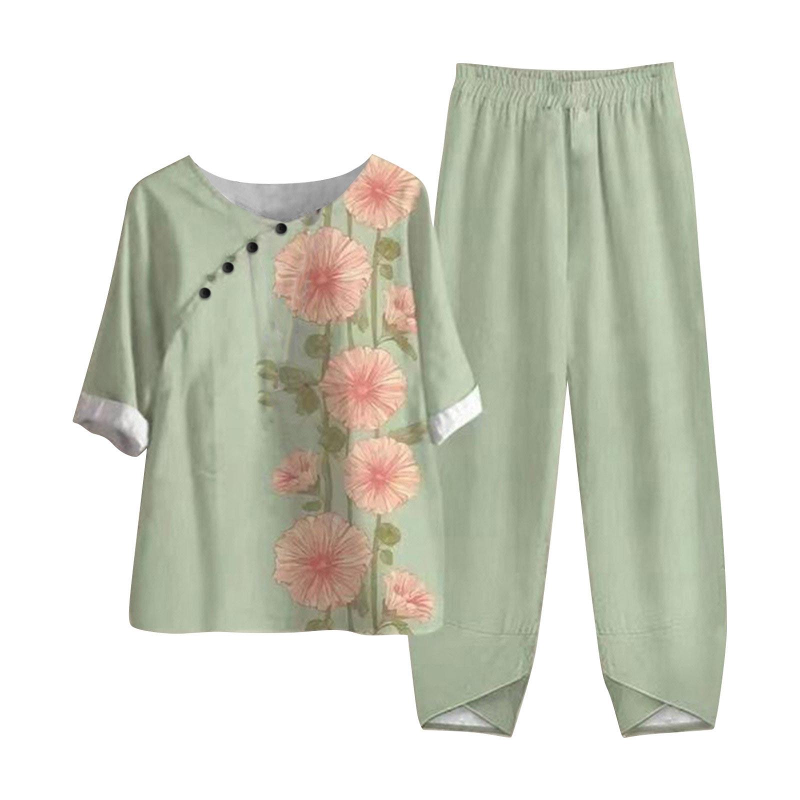 (SU)Женские летние топы с короткими рукавами и принтом, эластичная талия, брюки из девяти предметов, комплект из двух предметов S зелёный