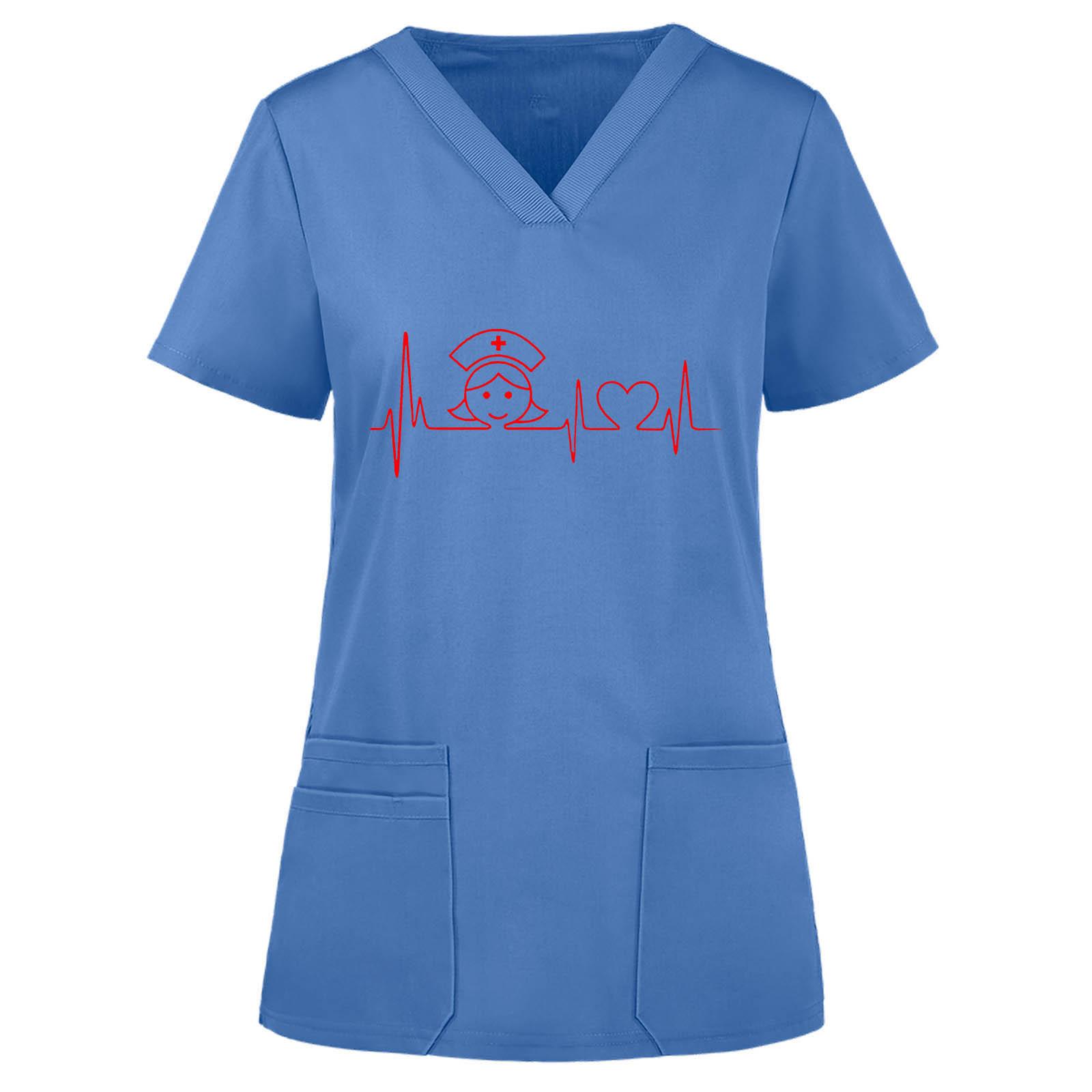 (SU)Женские топы с короткими рукавами и v-образным вырезом, рабочая однотонная блузка с карманами XL синий
