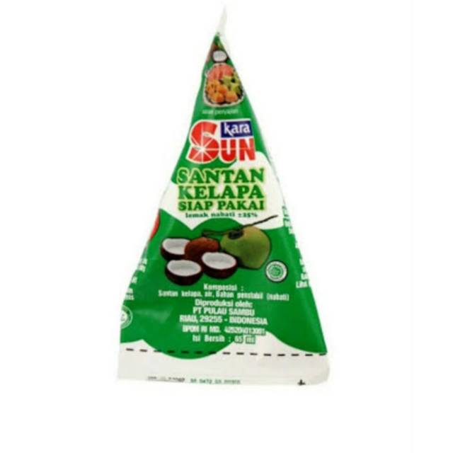 SUN Kara 65 ml santan kelapa siap pakai lemak nabati 24% .Dibuat dengan kelapa segar pilihan dan kekentalan yang konsisten. Bisa digunakan untuk membuat kari, nasi bersantan, kembang gula, kue-kue, puding, selai, es krim, macam-macam minuman dan masakan lainnya.