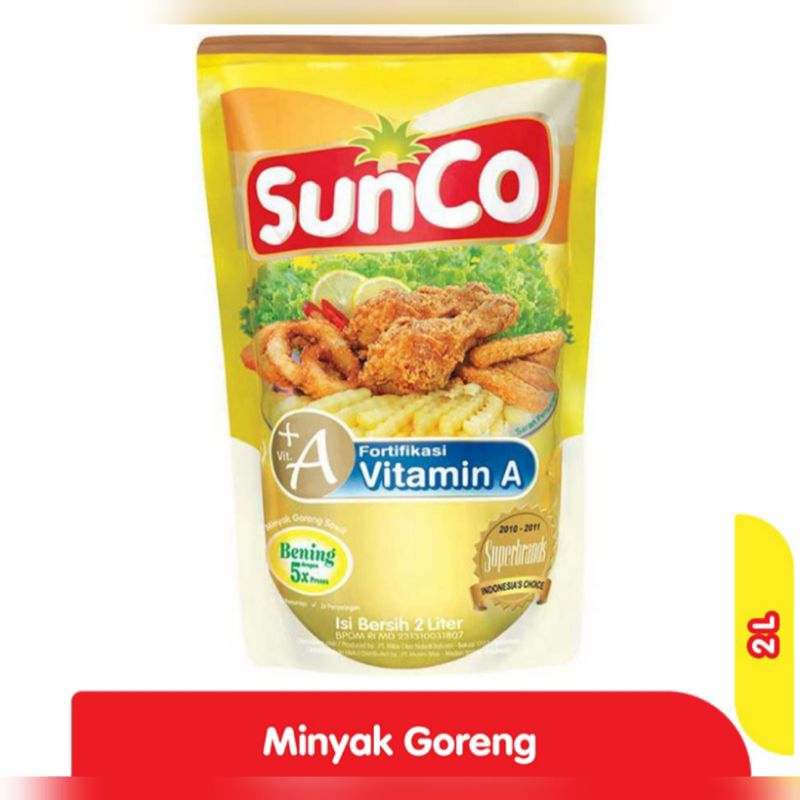 SunCo Minyak Goreng 2 L adalah minyak goreng masak yang diproduksi dari buah kelapa sawit segar pilihan dan difortifikasi dengan vitamin A. Diproses dengan teknologi mutakhir melalui 5 tahap pemrosesan, yakni 3 kali proses pemurnian dan 2 kali proses penyaringan sehingga menghasilkan minyak goreng yang baik dan berkualitas. Adapun ciri minyak goreng yang baik adalah warna minyak yang bening, tidak mudah beku, dan karakternya seperti air. Warna Sunco yang bening dan tidak cepat hitam atau teroksidasi dapat meminimalkan risiko kanker. Berbeda dengan minyak goreng sawit lain, Sunco tidak mudah beku karena mengandung asam lemak jenuh terendah yang dapat meminimalkan peningkatan kolesterol jahat. Tak hanya itu karakter Sunco yang seperti air, tidak lekat, dan tidak menyerap berlebih di makanan, membuat kegiatan makan lebih nyaman tanpa rasa gatal di tenggorokan.