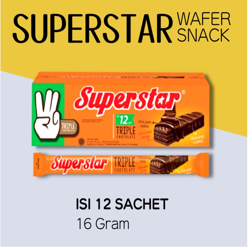 SUPERSTAR Triple Chocolate 16gr Box Isi 12 pcs Camilan Wafer Coklat snagat cocok untuk cemilan keluarga di rumah dan teman teman di mana pun anda berada.