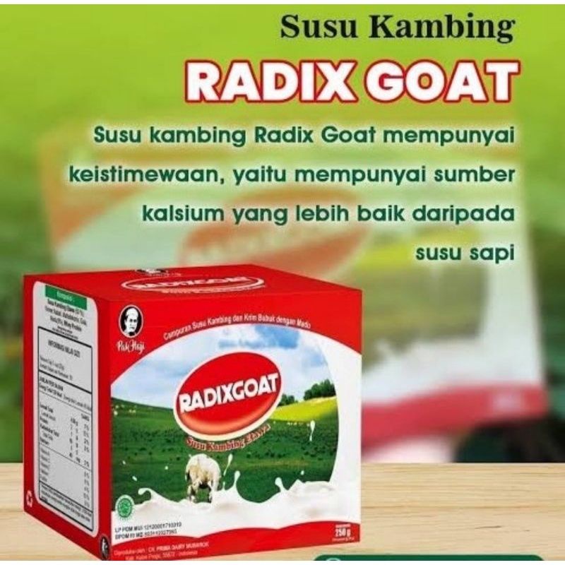 RADIX Goat adalah susu kambing ettawa bubuk yang diramu sedemikian rupa sehingga tetap enak untuk dikonsumsi. Tanpa bau prengus. Radix GOAT ini menggunakan madu sebagai pemanis, bukan gula.