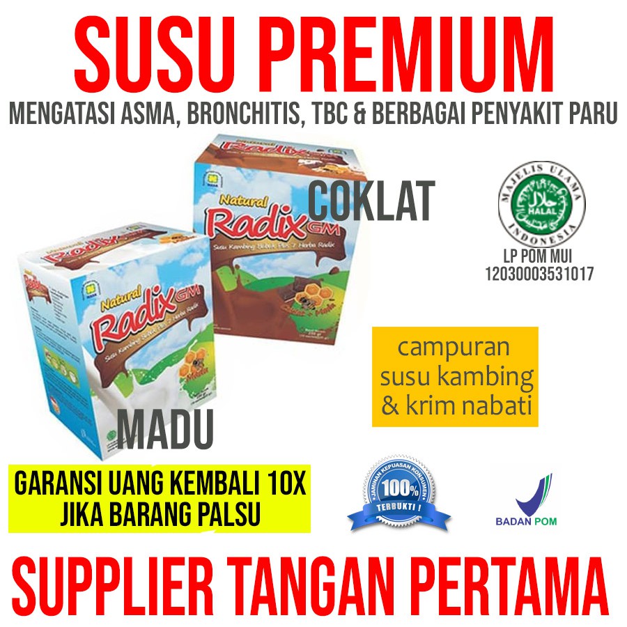 Natural Susu Kambing RADIX GM kini hadir dengan nama baru yaitu menjadi Susu Radik, Campuran Susu Kambing Bubuk dan Krim Nabati. Susu Radik ini hadir dalam 2 pilihan rasa: Madu dan Coklat dan dikemas dalam sachet dengan isi 5 sachet /box.