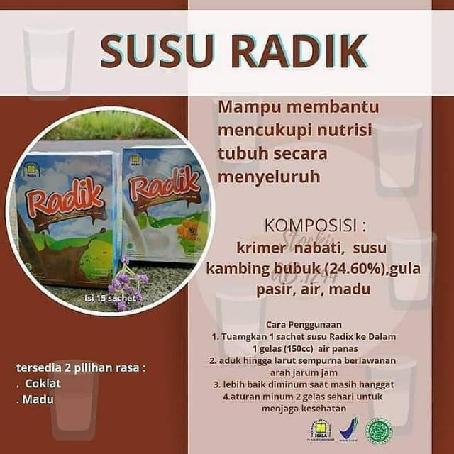 susu RADIK NASA ini terdiri dari dua rasa. Rasa coklat dan rasa madu.
