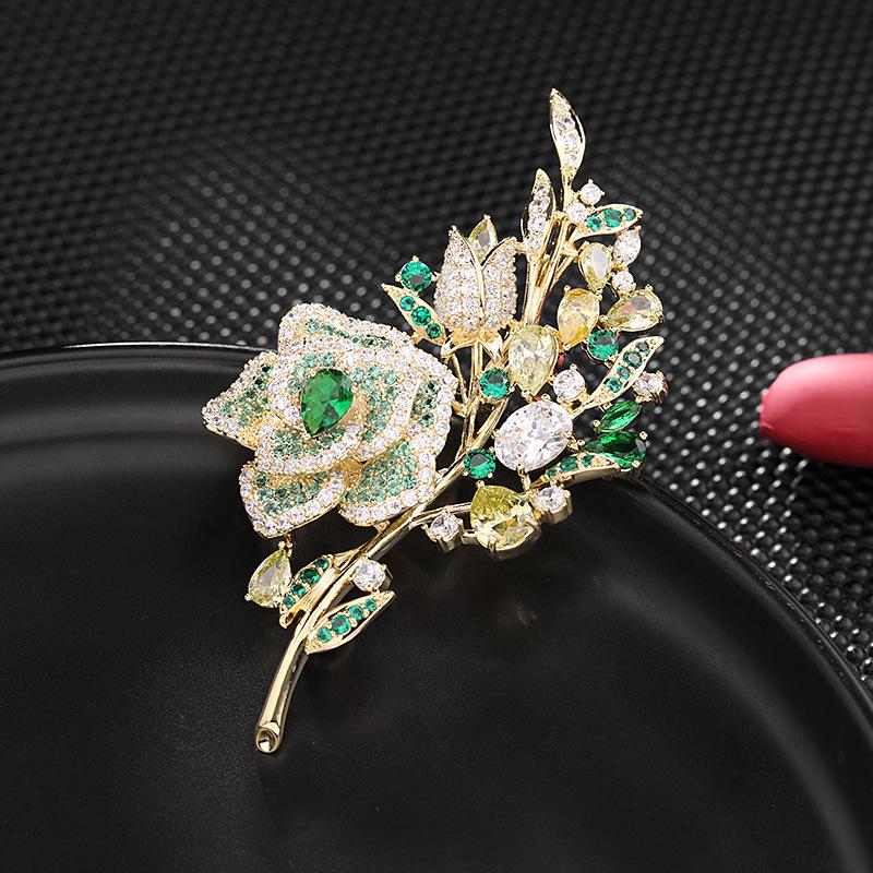 SUYU Роскошная женская брошь с микро-инкрустацией из меди и кубического циркония «Роза» для вечернего платья, аксессуары зелёный