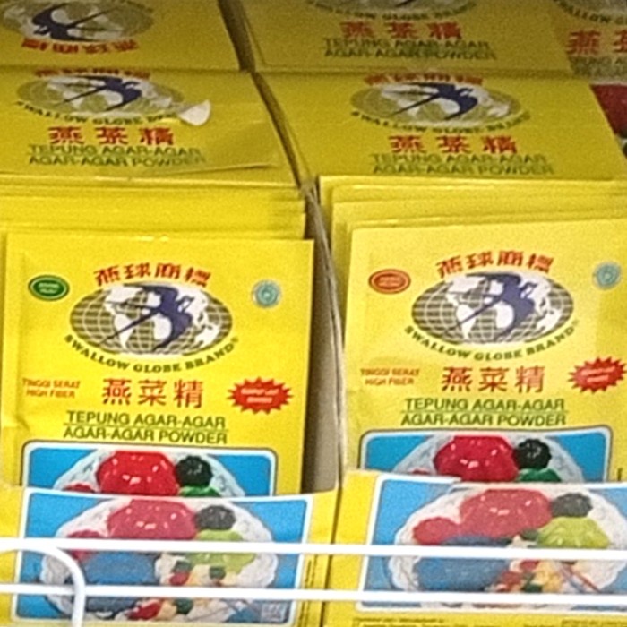 Swallow Globe Agar Agar Powder hadir dalam kemasan sachet berat 7g. Tepung ini terbuat dari sari rumput laut asli, memberikan tekstur serat tinggi. Cocok untuk berbagai kebutuhan memasak Anda.