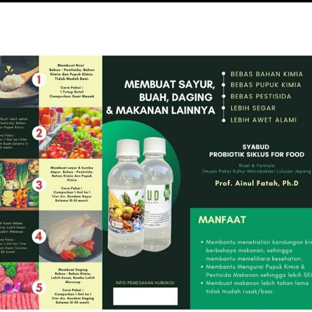 Ambil 1-3ml syabud campurkan air 1 Liter, rendam kurang lebih 30menit. Bary Kemudia dimasak. Sayur, buah, daging, ayam bebas dari pupuk kimia, bahan kimia dan pestisida.