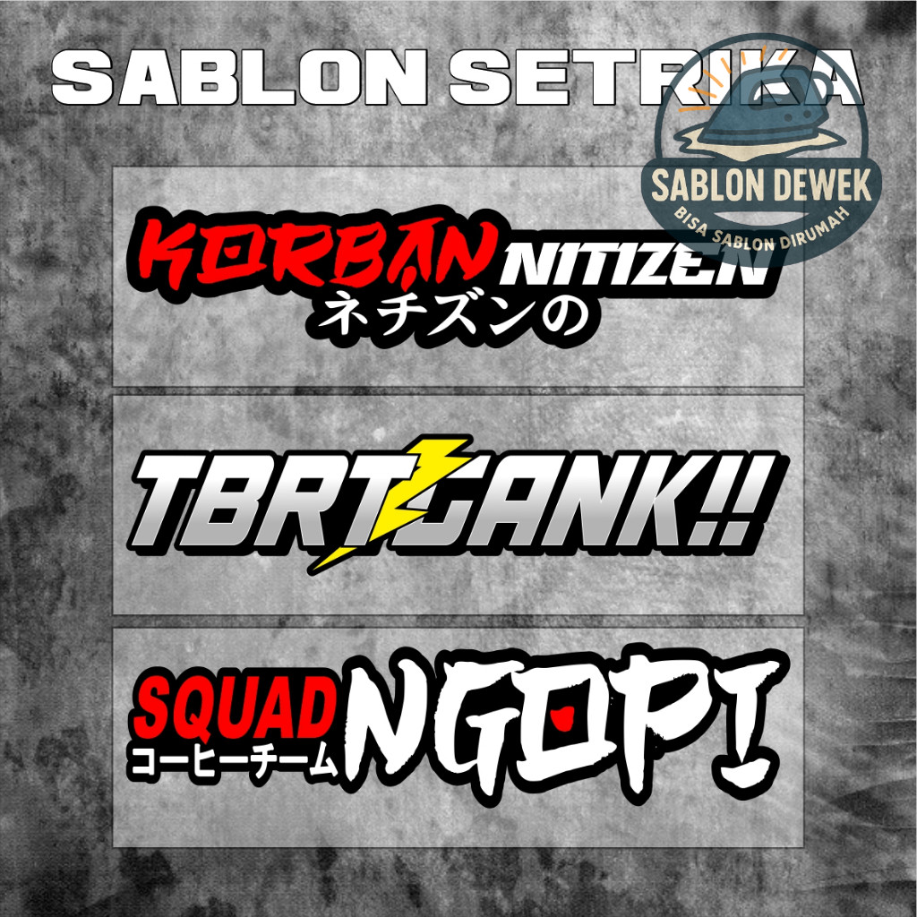 SABLON Setrika Sablon DTF SIAP PRESS ! spesifikasi produk : - Harga diatas merupakan harga satuan - TERSEDIA 2 UKURAN > BESAR : Lebar 25 cm X tinggi menyesuaikan ( ukuran ini hanya rata2 ) > KECIL : Lebar 12 cm X tinggi menyesuaikan ( ukuran ini hanya rata2 ) Di cetak menggunakan mesin DTF modern sehingga gambar lebih detail, tajam dan tidak pudar/blur. Menggunakan Tinta Import yang berkualitas sehingga tidak mudah luntur dan tahan lama. Tekstur sablon lentur serta tidak mudah retak, bahkan jika di setrika atau di sikat saat mencuci tidak rusak sama sekali. Sablon bisa di aplikasikan di berbagai media seperti; - Kaos - Celana - Jaket - Jas Hujan - Tas - Masker - Topi - Dll (kain katun, canvas, PE, parasut, apapun yang mengunakan bahan dasar kain bisa di tempel) - Kunjungi toko kami untuk melihat lebih banyak desain yg menarik. PRODUK SELALU READY STOCK >> RESELLER WELCOME