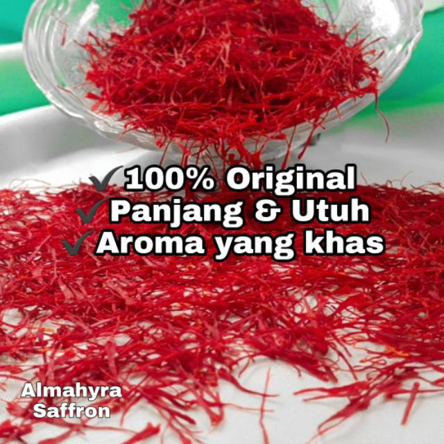 Harga yang tercantum untuk perhelai saffron. saffron dipastikan berukuran panjang dan utuh serta memiliki aroma yang khas.