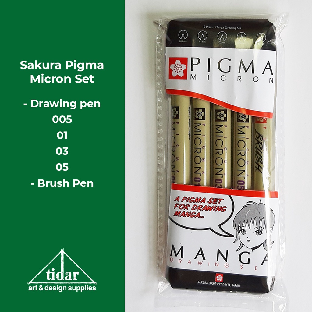 Sakura pigma micron set adalah satu set drawing pen dan brush pen untuk menggambar manga, gambar kerja untuk anak desain interior, arsitektur, atau teknik sipil, ilustrasi untuk anak graphic design.