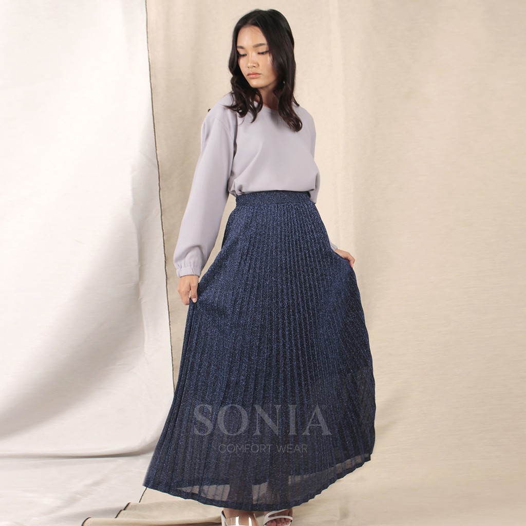 Mengapa pilih produk SONIA?SONIA adalah busana pilihannya jutaan wanita Indonesia sejak tahun 1992. Model model pakaian kami selalu up to date dan trendy! Produk pakaian SONIA hanya menggunakan bahan-bahan terpilih yang kualitasnya sangat tinggi. Bahan tekstil yang digunakan selalu tebal namun tetap adem, nyaman dan tidak nerawang ketika dipakai. Silahkan cek ulasan toko kami kalau masih ragu dengan produk SONIA.Harganya lumayan mahal ya?Jelasnya harga sesuai kualitas ya kak, daripada beli yang murah sekali cuci langsung luntur & melar bahannya, rugi kan kalau harus beli lagi? Kalau beli produk SONIA dijamin tetap awet untuk dipakai bertahun tahun kedepan!Nama Produk: Sally Skirt•Kode Produk: R1964•Warna: Silver, Bronze/brown, Black, Dark Blue•Harga: 240 rb•Bahan: furing terbuat dari premium jersey spandex, luaran terbuat dari glitter import plisket•Ukuran: All size (Fit M to XXL)Lingkar Pinggang: 66 cm (lingkar pinggang full karet bisa stretch sampai 100 cm)Lingkar Pinggul: 114 cm (sebelum stretch)Panjang luaran: 100 cmPanjang furing: 77 cm