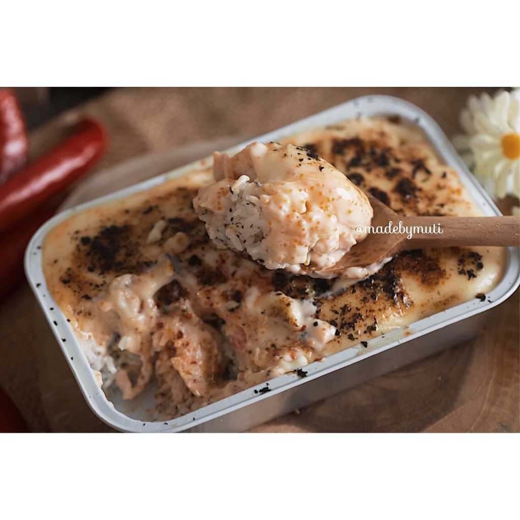 Nasi dengan bumbu khas sushi dan taburan nori dipadukan dengan baked salmon (matang sempurna) dan baked kani (crab stick, matang sempurna) disiram dengan saus mayonaise khas jepang yg dipadukan dengan Tobiko dan taburan nori, lalu di baked dengan cara torch, menambah cita rasa yang wangi dan lezat. Creamy mayo dengan paduan full daging salmon dan kani, bisa dipastikan bikin kamu nagih dan nagih lagi