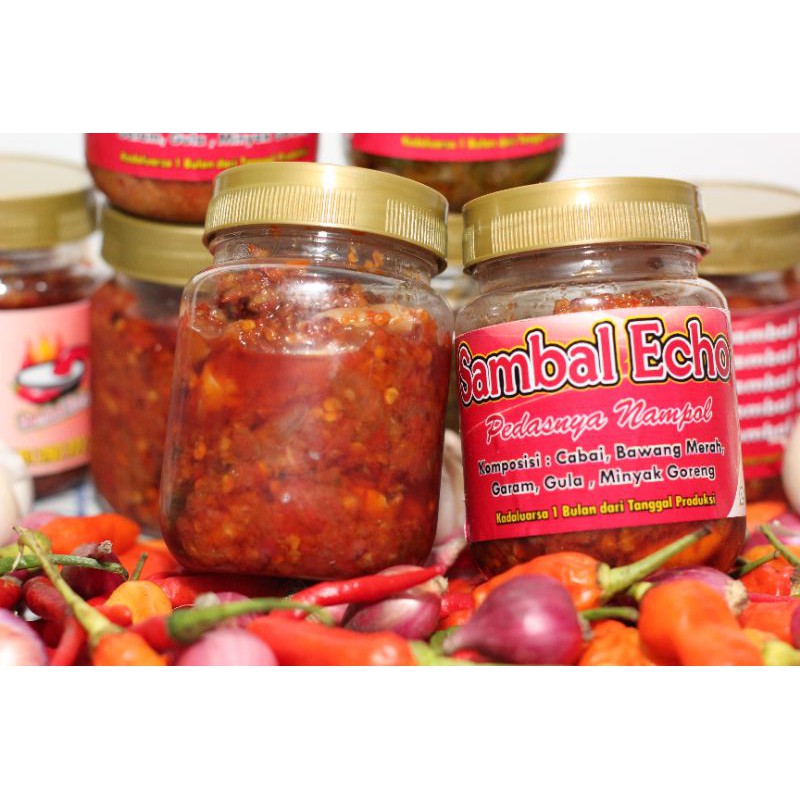 Menyediakan Sambal kemasan botol yang praktis dan higenis tanpa bahan pengawet yang bercita rasa ECHO PEDES NAMPOLL PISAN. Foto hanya Mewakili salah satu dari produk kami.