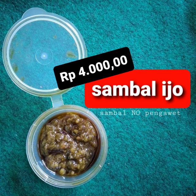 Sambal ijo yang dibuat dari lombok ijo tetapi ada ikan teri nasi keringnya dan dibuat tanpa pengawet. Tetapi tahan lama jika disimpan dikulkas. Dijamin mantul rasanya