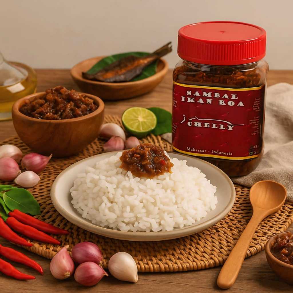 Sambal Ikan Roa Chelly merupakan sambal ikan roa premium yang hanya menggunakan daging ikan roa (tanpa tulang, isi perut, dan kepala ikan roa), higienis, dan tanpa bahan pengawet buatan.