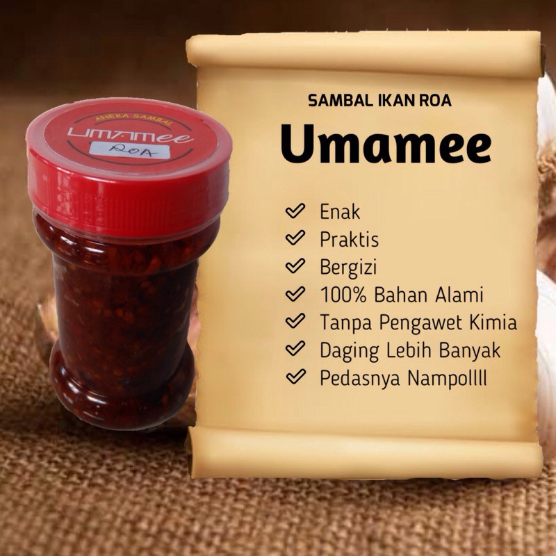Sambal Umamee kemasan 130gr adalah sambal yang praktis untuk makan sehari-hari dan mengandung banyak gizi serta vitamin yang terdapat di dalam bahan-bahannya.