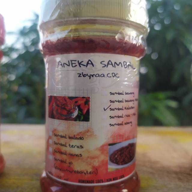 Sambal Kalasan 100% homemade non MSG di racik dengan bahan berkualitas komposisi : cabe. Bawang, garam, gula dll. Kemasan botol 150gr. Nett 125gr.