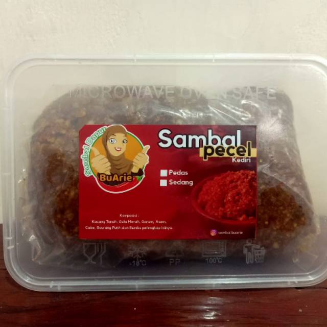 Sambal Pecel Khas Kediri dibuat dari bahan kacang tanah pilihan, dengan bumbu cabe rawit, cabe merah, gula merah asli, daun jeruk purut, bawang putih, garam, serta bumbu rempah lainnya.