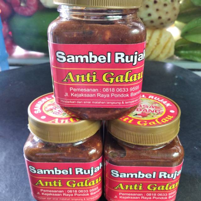 Sambal rujak ini dibuat secara manual di uleg langsung. Tanpa ada campuran bahan pengawet,kuat bertahan skitar 12bulan. Bisa riques tingkat kepedasannya. Bahan yg digunakan