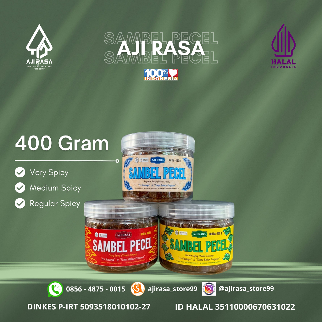 Sambal pecel Aji Rasa diproses dengan takaran yang pasti sehingga memiliki rasa yang pas. Kami memproduksi setiap hari dan penjualan dengan cara offline dan online. Rasa kami jamin enak dan bisa disimpan di lemari pendingin sehingga bisa tahan lama. Sebelum mencoba pasti masih gamang untuk rasanya. Anda akan percaya dengan kami kalau sudah mencoba..yuk pesan pasti akan puas rasanya.